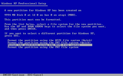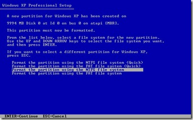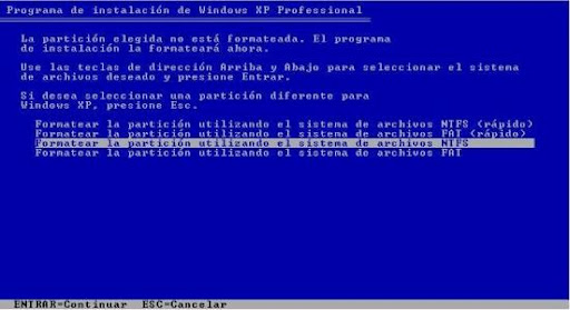 La siguiente pantalla que nos muestra es para indicarnos el tipo de formateo que deseamos para nuestro disco duro, yo acostumbro a usar sistema de archivos NTFS, aunque hay personas que dicen que les funciona mejor el ordenador con partición en FAT, eso va en gustos, así que seleccionáis el sistema de archivos para la partición y pulsáis sobre Enter.