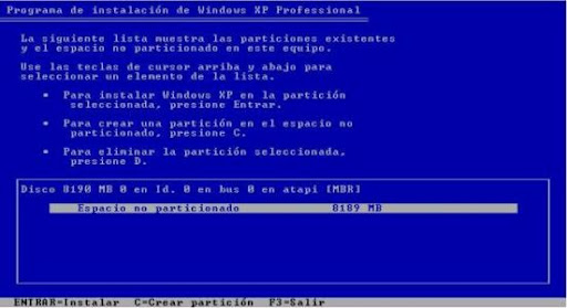 Para comenzar metemos en la unidad de CD nuestro disco de Windows XP y arrancamos o reiniciamos el ordenador. En la mayoría de las configuraciones el arranque usa la secuencia 1º Disquetera , 2º CD, 3º Disco duro , así que en la mayoría de los casos al detectar el disco de instalación introducido el ordenador arrancará desde el CD, si no es así, tendremos que decirle que arranque desde el CD. Una vez que hemos arrancado desde el CD, Windows nos presentara la primera pantalla. Como vamos a instalar de nuevo Windows le pulsamos a Enter.