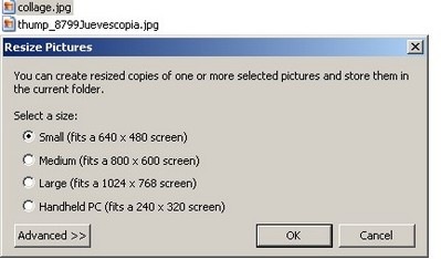 Como veis en la captura, una vez instalado el Image Resize al hacer clic con el botón derecho del ratón en una imagen nos aparecerá en el menú contextual la opción Resize Pictures. Hacemos clic en ella y nos aparecerá un menú donde podremos elegir entre 4 tipos de tamaños estándar.